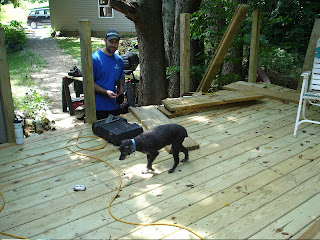 Here are some pictures of the deck Aaron has been working on for Jack and Rita, he is almost finished and it's looking great :) Ian and I were out there yesterday and Ian got to play with the doggies, he loves going out to Grandpa & Grandmommie's house :)